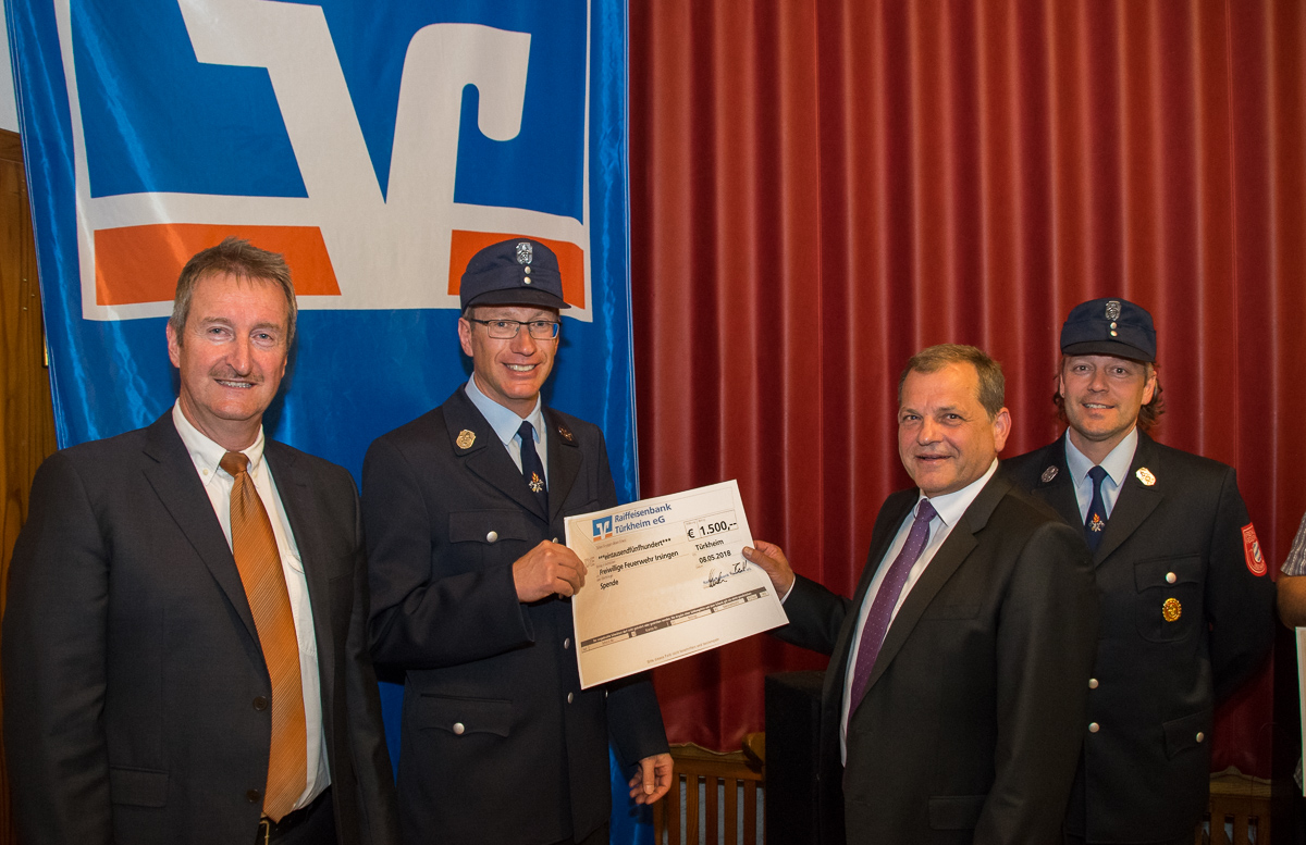 Bei der Hauptversammlung der Raiffeisenbank Türkheim eG konnte sich die Freiwillige Feuerwehr Irsingen über einen Spendenscheck in Höhe von 1.500 Euro freuen